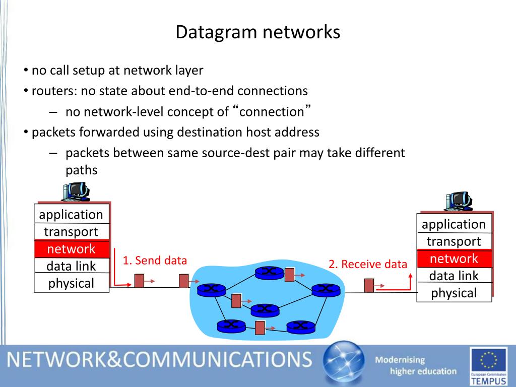 no call setup at network layer routers: no state about end-to-end connections no network-level concept of “connection” packets forwarded using destination host address packets between same source-dest pair may take different paths application transport network data link physical application transport network data link physical Datagram networks 1. Send data 2. Receive data