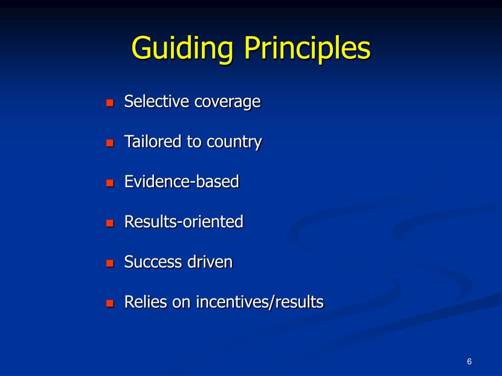 Guiding Principles • Selective coverage • Tailored to country • Evidence-based • Results-oriented • Success driven • Relies on incentives/results