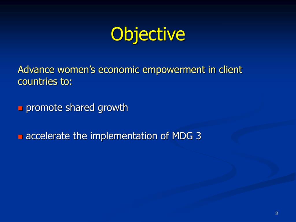 Objective Advance women’s economic empowerment in client countries to: • promote shared growth • accelerate the implementation of MDG 3