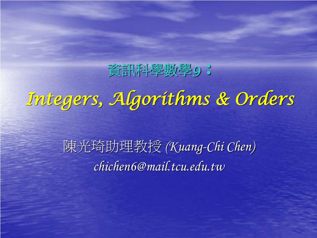 資訊科學數學9 :Integers, Algorithms & Orders 陳光琦助理教授 (Kuang-Chi Chen) chichen6@mail.tcu.edu.tw