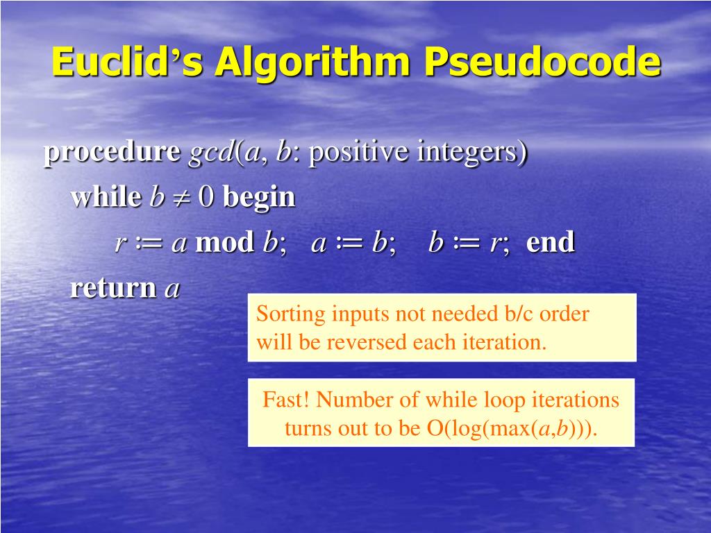 Euclid’s Algorithm Pseudocode procedure gcd(a, b: positive integers) whileb 0 begin r≔amodb; a≔b; b≔r; end return a Sorting inputs not needed b/c order will be reversed each iteration. Fast! Number of while loop iterationsturns out to be O(log(max(a,b))).