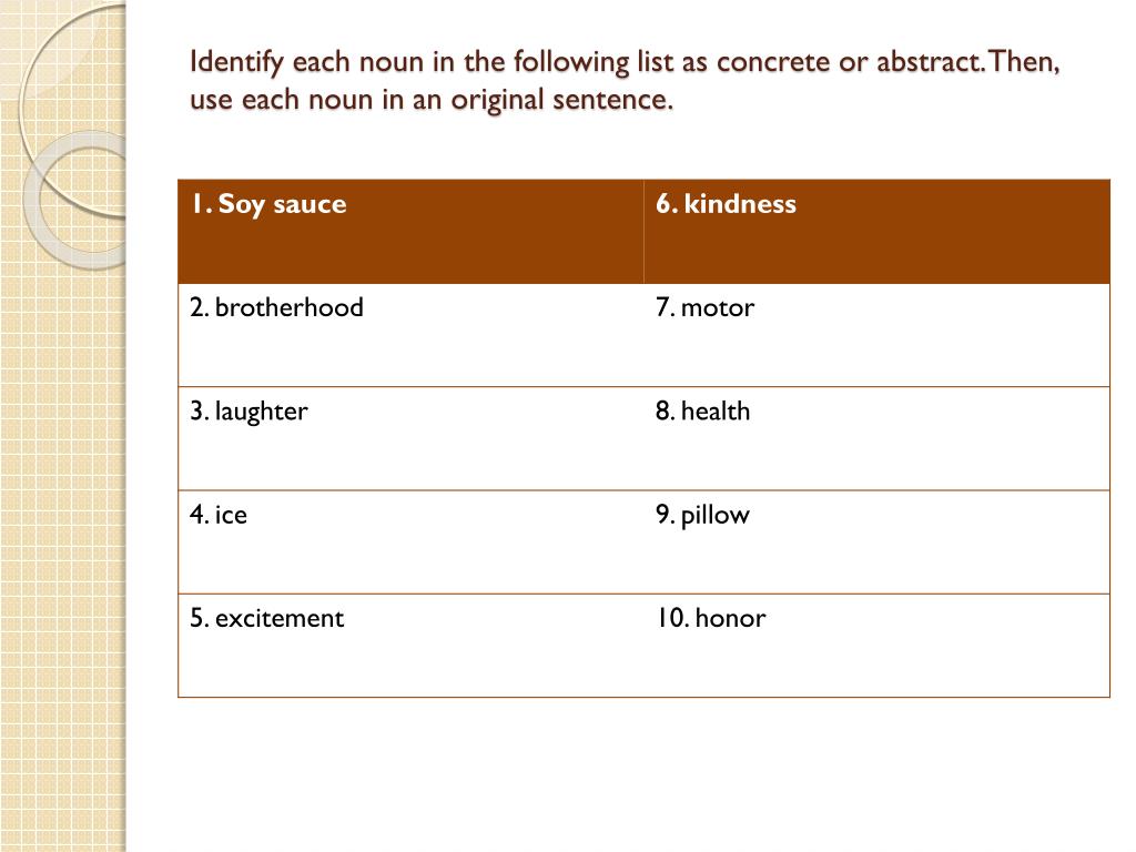 Concrete and Abstract Nouns • A concrete noun names a person, place, or thing that can be perceived by one or more of the five senses (sight, hearing, taste, touch, smell). • An abstract noun names an idea, a feeling, a quality, or a characteristic.