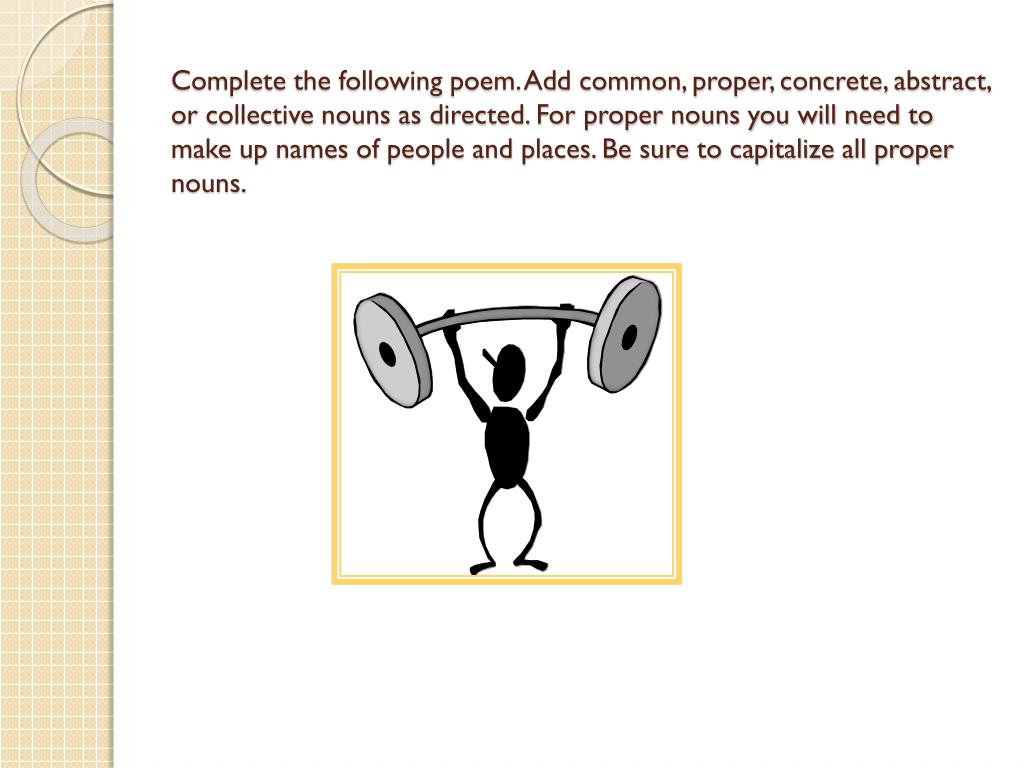 Complete the following poem. Add common, proper, concrete, abstract, or collective nouns as directed. For proper nouns you will need to make up names of people and places. Be sure to capitalize all proper nouns.