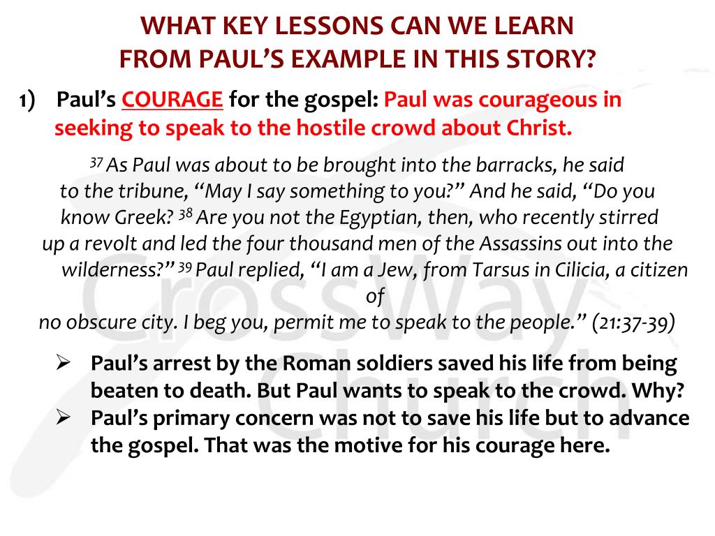 WHAT KEY LESSONS CAN WE LEARN FROM PAUL’S EXAMPLE IN THIS STORY? 1) Paul’s COURAGE for the gospel: Paul was courageous in seeking to speak to the hostile crowd about Christ. 37 As Paul was about to be brought into the barracks, he said to the tribune, “May I say something to you?” And he said, “Do you know Greek? 38 Are you not the Egyptian, then, who recently stirred up a revolt and led the four thousand men of the Assassins out into the wilderness?” 39 Paul replied, “I am a Jew, from Tarsus in Cilicia, a citizen of no obscure city. I beg you, permit me to speak to the people.” (21:37-39) • Paul’s arrest by the Roman soldiers saved his life from being beaten to death. But Paul wants to speak to the crowd. Why? • Paul’s primary concern was not to save his life but to advance the gospel. That was the motive for his courage here.