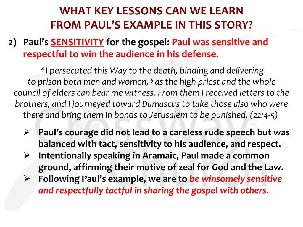 WHAT KEY LESSONS CAN WE LEARN FROM PAUL’S EXAMPLE IN THIS STORY? 2) Paul’s SENSITIVITY for the gospel: Paul was sensitive and respectful to win the audience in his defense. 40 And when he had given him permission, Paul, standing on the steps, motioned with his hand to the people. And when there was a great hush, he addressed them in the Hebrew language, saying: 1“Brothers and fathers, hear the defense that I now make before you.” 2 And when they heard that he was addressing them in the Hebrew language, they became even more quiet. And he said: 3 “I am a Jew, born in Tarsus in Cilicia, but brought up in this city, educated at the feet of Gamaliel according to the strict manner of the law of our fathers, being zealous for God as all of you are this day. (21:40-22:3)