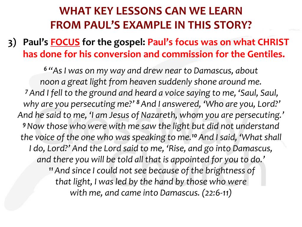 WHAT KEY LESSONS CAN WE LEARN FROM PAUL’S EXAMPLE IN THIS STORY? 3) Paul’s FOCUS for the gospel: Paul’s focus was on what CHRIST has done for his conversion and commission for the Gentiles. 6 “As I was on my way and drew near to Damascus, about noon a great light from heaven suddenly shone around me. 7 And I fell to the ground and heard a voice saying to me, ‘Saul, Saul, why are you persecuting me?’8 And I answered, ‘Who are you, Lord?’ And he said to me, ‘I am Jesus of Nazareth, whom you are persecuting.’ 9 Now those who were with me saw the light but did not understand the voice of the one who was speaking to me.10 And I said, ‘What shall I do, Lord?’ And the Lord said to me, ‘Rise, and go into Damascus, and there you will be told all that is appointed for you to do.’ 11 And since I could not see because of the brightness of that light, I was led by the hand by those who were with me, and came into Damascus. (22:6-11)