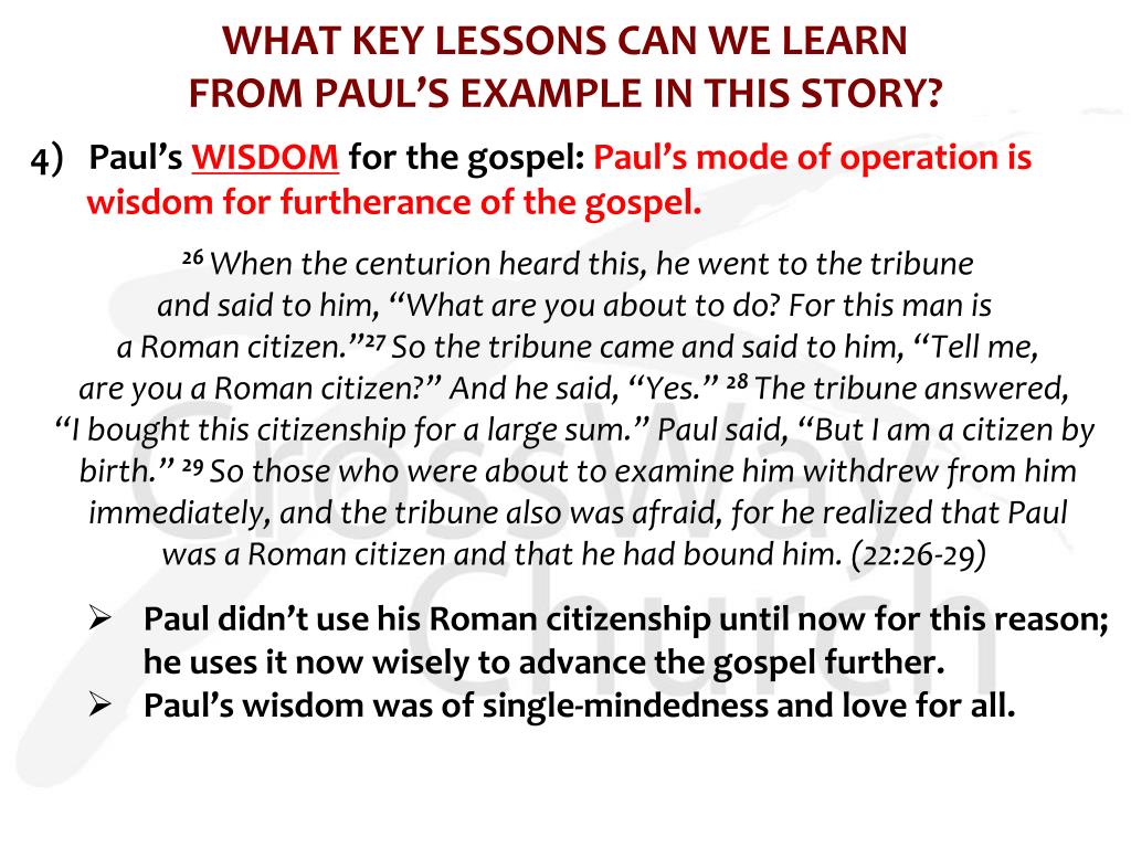 WHAT KEY LESSONS CAN WE LEARN FROM PAUL’S EXAMPLE IN THIS STORY? 4) Paul’s WISDOM for the gospel: Paul’s mode of operation is wisdom for furtherance of the gospel. 26 When the centurion heard this, he went to the tribune and said to him, “What are you about to do? For this man is a Roman citizen.”27 So the tribune came and said to him, “Tell me, are you a Roman citizen?” And he said, “Yes.”28 The tribune answered, “I bought this citizenship for a large sum.” Paul said, “But I am a citizen by birth.”29 So those who were about to examine him withdrew from him immediately, and the tribune also was afraid, for he realized that Paul was a Roman citizen and that he had bound him. (22:26-29) • Paul didn’t use his Roman citizenship until now for this reason; he uses it now wisely to advance the gospel further. • Paul’s wisdom was of single-mindedness and love for all.