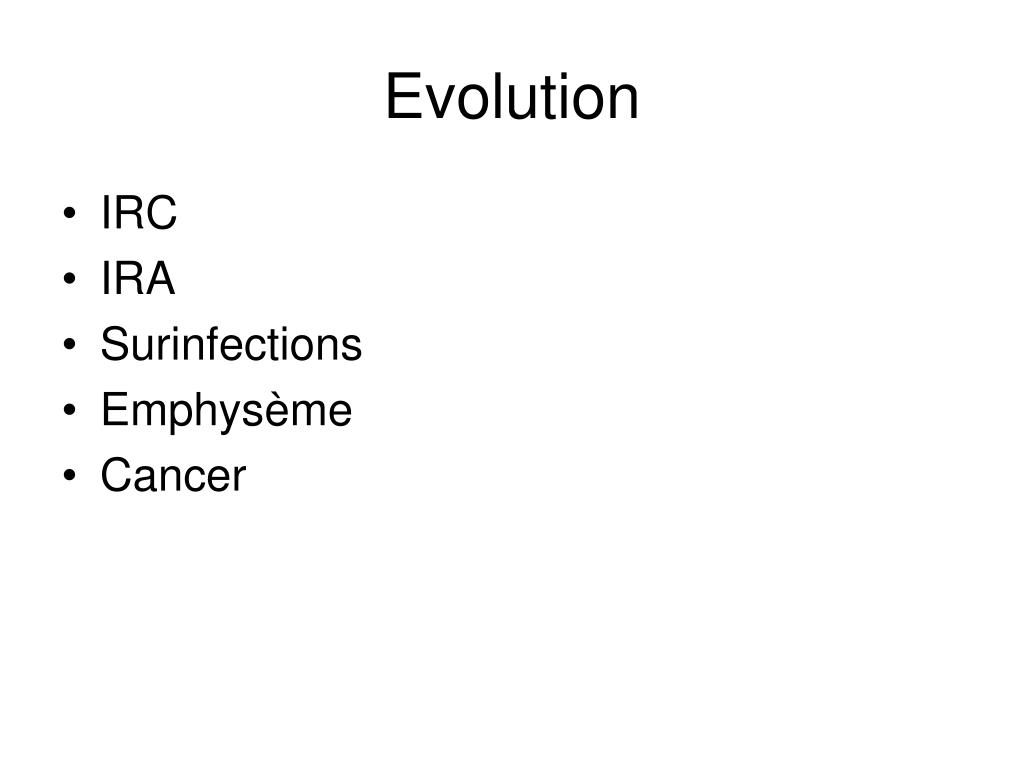 Evolution • IRC • IRA • Surinfections • Emphysème • Cancer