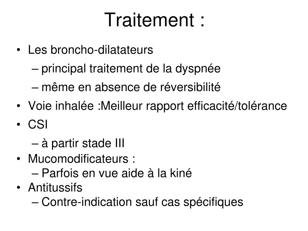 Traitement : • Les broncho-dilatateurs • principal traitement de la dyspnée • même en absence de réversibilité • Voie inhalée :Meilleur rapport efficacité/tolérance • CSI • à partir stade III • Mucomodificateurs : • Parfois en vue aide à la kiné • Antitussifs • Contre-indication sauf cas spécifiques