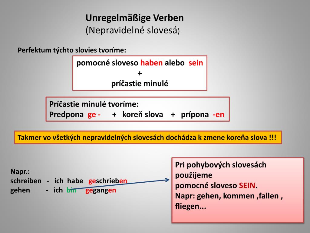 UnregelmäßigeVerben (Nepravidelné slovesá) Perfektum týchto slovies tvoríme: pomocné sloveso haben alebo sein + príčastie minulé Príčastie minulé tvoríme: Predpona ge - + koreň slova + prípona -en Takmer vo všetkých nepravidelných slovesách dochádza k zmene koreňa slova !!! Pri pohybových slovesách použijeme pomocné sloveso SEIN. Napr: gehen, kommen ,fallen , fliegen... Napr.: schreiben - ich habe geschrieben gehen - ich bingegangen