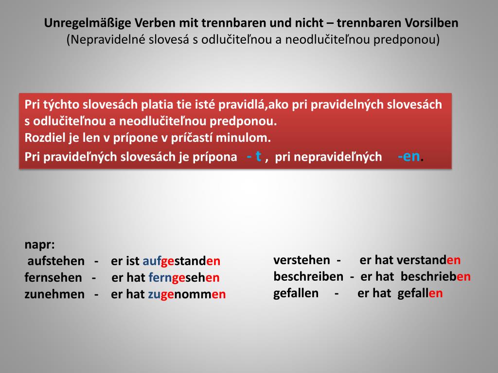 UnregelmäßigeVerbenmittrennbarenundnicht – trennbarenVorsilben (Nepravidelné slovesá s odlučiteľnou a neodlučiteľnou predponou) Pri týchto slovesách platia tie isté pravidlá,ako pri pravidelných slovesách s odlučiteľnou a neodlučiteľnou predponou. Rozdiel je len v prípone v príčastí minulom. Pri pravideľných slovesách je prípona - t , pri nepravideľných-en. napr: aufstehen - eristaufgestanden fernsehen - erhatferngesehen zunehmen - erhatzugenommen verstehen - erhatverstanden beschreiben - erhatbeschrieben gefallen - erhatgefallen