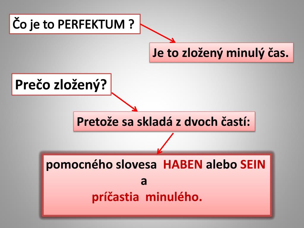 Čo je to PERFEKTUM ? Je to zložený minulý čas. Prečo zložený? Pretože sa skladá z dvoch častí: pomocného slovesa HABEN alebo SEIN a príčastia minulého.