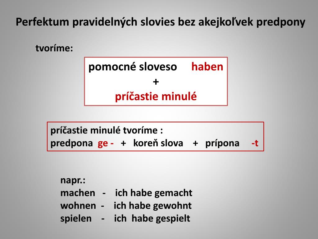 Perfektum pravidelných slovies bez akejkoľvek predpony tvoríme: pomocné sloveso haben + príčastie minulé príčastie minulé tvoríme : predpona ge - + koreň slova + prípona -t napr.: machen - ich habe gemacht wohnen - ich habe gewohnt spielen - ich habe gespielt