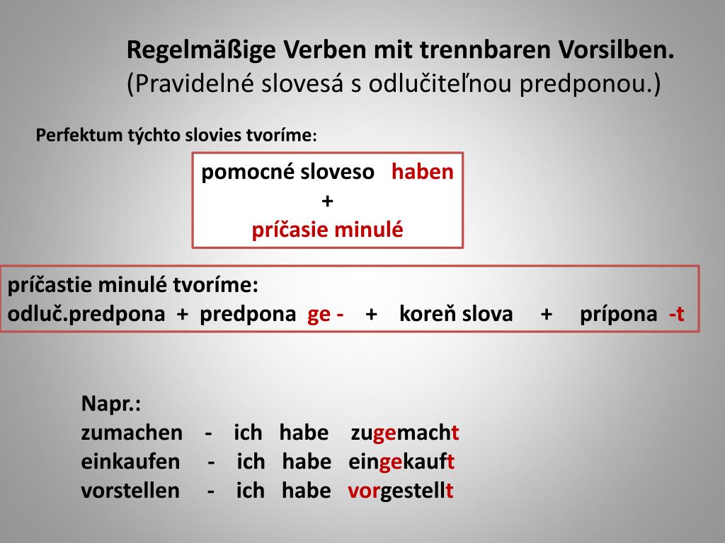 RegelmäßigeVerbenmittrennbarenVorsilben. (Pravidelné slovesá s odlučiteľnou predponou.) Perfektum týchto slovies tvoríme: pomocné sloveso haben + príčasie minulé príčastie minulé tvoríme: odluč.predpona + predpona ge - + koreň slova + prípona -t Napr.: zumachen - ich habe zugemacht einkaufen - ich habe eingekauft vorstellen - ich habe vorgestellt