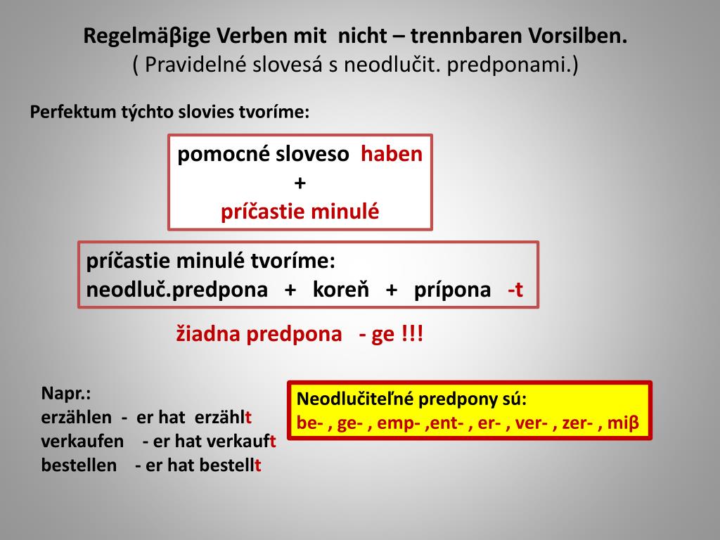 RegelmäβigeVerbenmitnicht – trennbarenVorsilben. ( Pravidelné slovesá s neodlučit. predponami.) Perfektum týchto slovies tvoríme: pomocné sloveso haben + príčastie minulé príčastie minulé tvoríme: neodluč.predpona + koreň + prípona -t žiadna predpona - ge !!! Napr.: erzählen - erhaterzählt verkaufen - erhatverkauft bestellen - erhatbestellt Neodlučiteľné predpony sú: be- , ge- , emp- ,ent- , er- , ver- , zer- , miβ