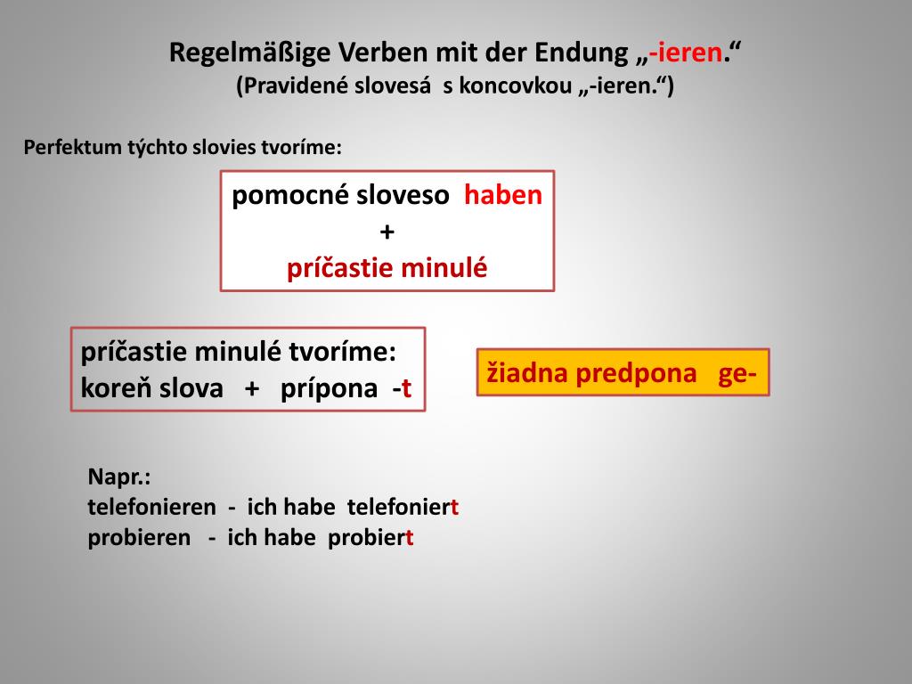 RegelmäßigeVerbenmit der Endung „-ieren.“ (Pravidené slovesá s koncovkou „-ieren.“) Perfektum týchto slovies tvoríme: pomocné sloveso haben + príčastie minulé príčastie minulé tvoríme: koreň slova + prípona -t žiadna predpona ge- Napr.: telefonieren - ich habe telefoniert probieren - ich habe probiert