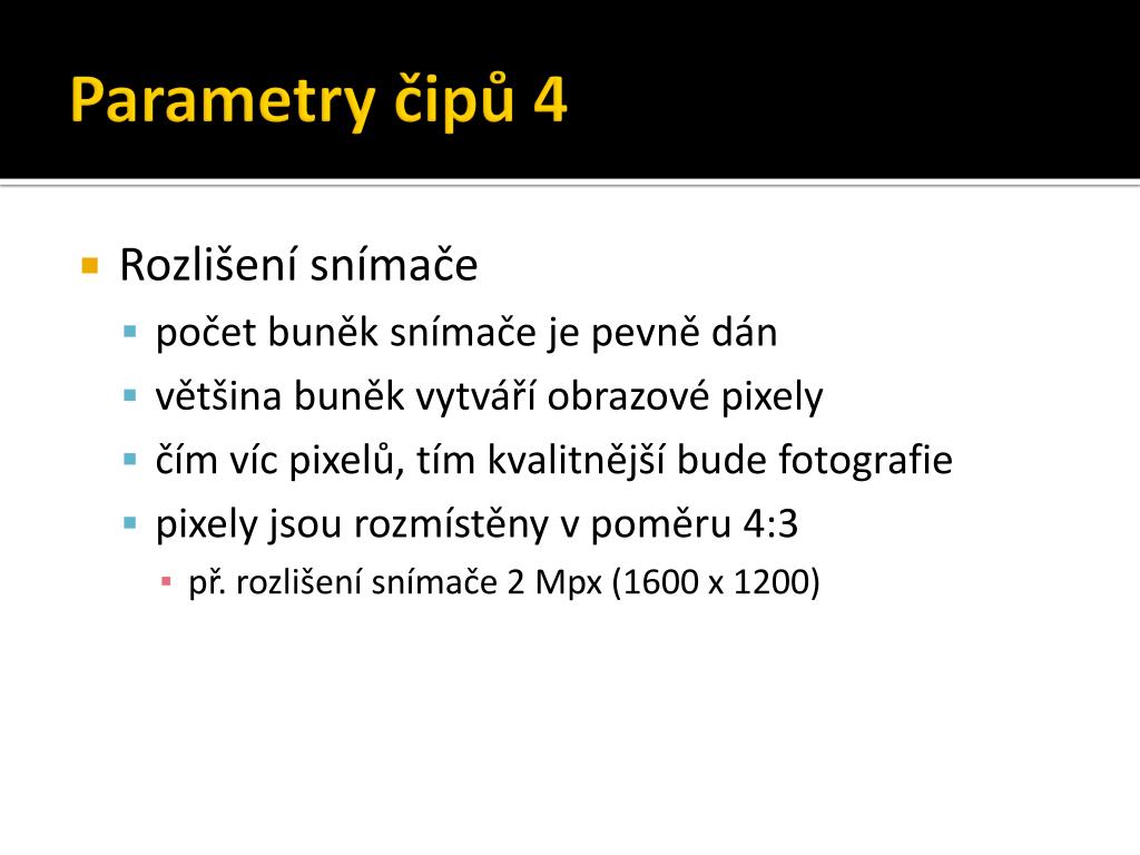 Parametry čipů 4 • Rozlišení snímače • počet buněk snímače je pevně dán • většina buněk vytváří obrazové pixely • čím víc pixelů, tím kvalitnější bude fotografie • pixely jsou rozmístěny v poměru 4:3 • př. rozlišení snímače 2 Mpx (1600 x 1200)