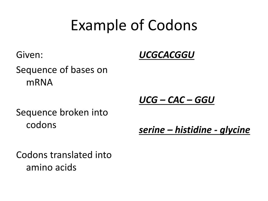 Example of Codons Given: Sequence of bases on mRNA Sequence broken into codons Codons translated into amino acids UCGCACGGU UCG – CAC – GGU serine – histidine - glycine