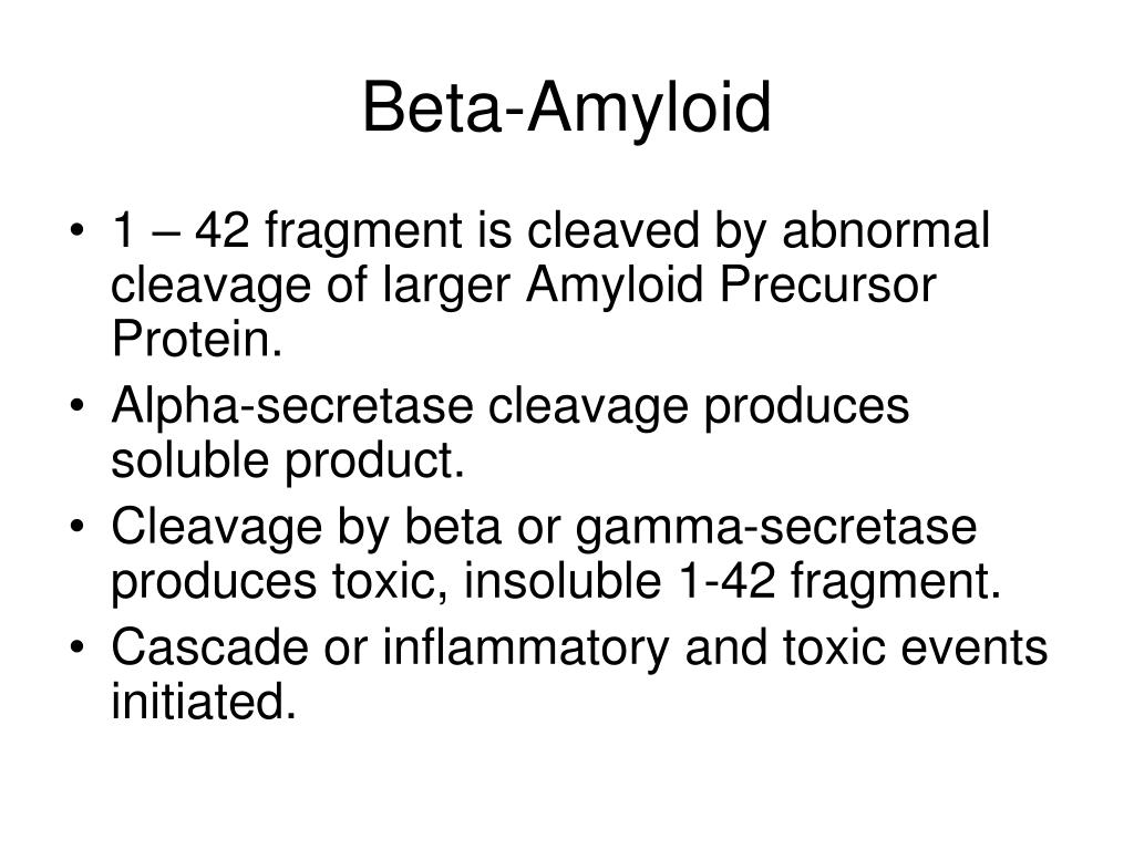 Beta-Amyloid • 1 – 42 fragment is cleaved by abnormal cleavage of larger Amyloid Precursor Protein. • Alpha-secretase cleavage produces soluble product. • Cleavage by beta or gamma-secretase produces toxic, insoluble 1-42 fragment. • Cascade or inflammatory and toxic events initiated.