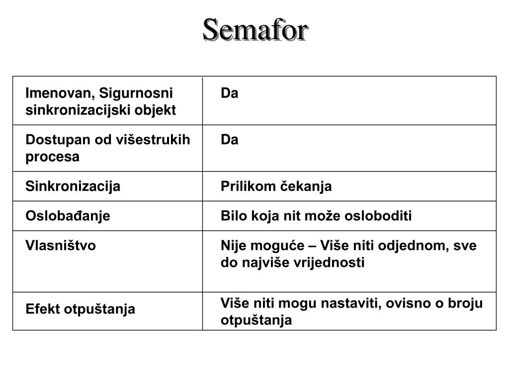 Semafor Imenovan, Sigurnosni sinkronizacijski objekt Dostupan od višestrukih procesa Sinkronizacija Oslobađanje Vlasništvo Efekt otpuštanja Da Da Prilikom čekanja Bilo koja nit može osloboditi Nije moguće – Više niti odjednom, sve do najviše vrijednosti Više niti mogu nastaviti, ovisno o broju otpuštanja