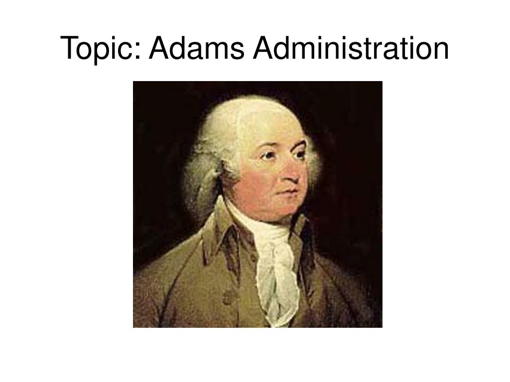 Topic: Adams Administration. Presidential Election of 1796 VP Adams (Fed) versus Secretary of State Jefferson (Rep) first disputed election / very nasty election (mudslinging) Jefferson was attacked for not being religious and for his closeness to the French Revolution.