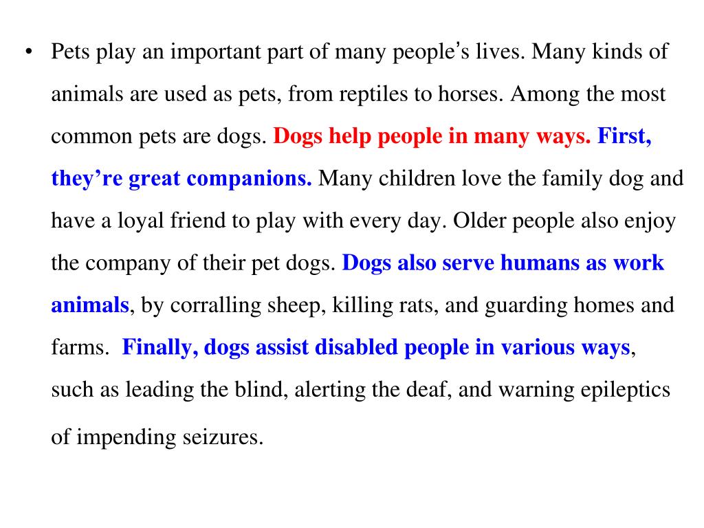 Pets play an important part of many people’s lives. Many kinds of animals are used as pets, from reptiles to horses. Among the most common pets are dogs. Dogs help people in many ways. First, they’re great companions. Many children love the family dog and have a loyal friend to play with every day. Older people also enjoy the company of their pet dogs. Dogs also serve humans as work animals, by corralling sheep, killing rats, and guarding homes and farms. Finally, dogs assist disabled people in various ways, such as leading the blind, alerting the deaf, and warning epileptics of impending seizures. Pets are often an important part of people’s lives. Different types of animals can be pets, ranging from reptiles to horses. One of the most common pets is a dog. Dogs serve a variety of purposes for humankind. One way dogs serve humans is they are great just for companionship. Many an only child has bonded with his/her “Fido,” thus having a willing and loyal friend to play with on a daily basis. Additionally, dogs have served humans as work animals, corralling sheep, conquering rats, and guarding the homestead. Finally, dogs also assist people, for example, by leading the blind, alerting the deaf, and alerting epileptics of impending seizures.