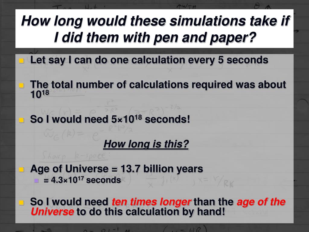 How long would these simulations take if I did them with pen and paper? • Let say I can do one calculation every 5 seconds • The total number of calculations required was about 1018 • So I would need 5×1018 seconds! How long is this? • Age of Universe = 13.7 billion years • = 4.3×1017 seconds • So I would need ten times longer than the age of the Universe to do this calculation by hand!