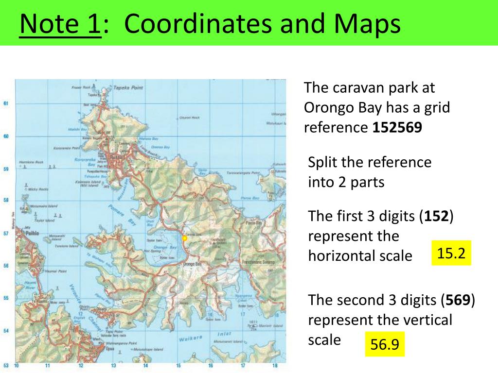 Note 1: Coordinates and Maps The caravan park at Orongo Bay has a grid reference 152569 Split the reference into 2 parts The first 3 digits (152) represent the horizontal scale 15.2 The second 3 digits (569) represent the vertical scale 56.9
