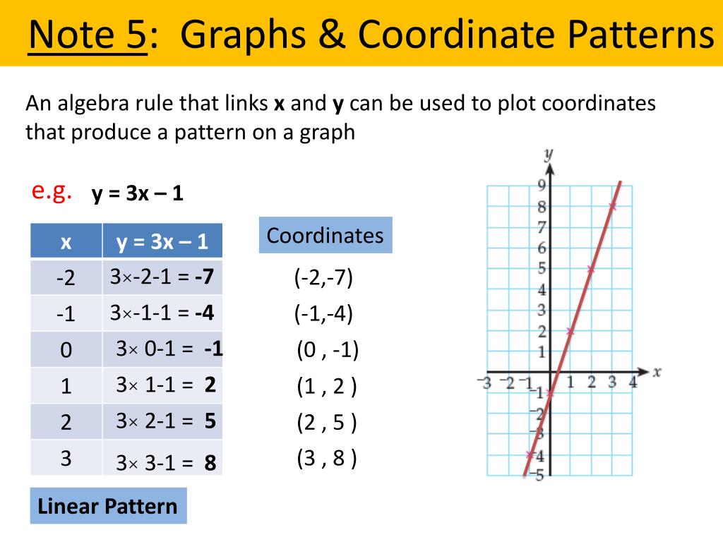 Note 5: Graphs & Coordinate Patterns An algebra rule that links x and y can be used to plot coordinates that produce a pattern on a graph e.g. y = 3x – 1 Coordinates (-2,-7) 3×-2-1 = -7 (-1,-4) 3×-1-1 = -4 3× 0-1 = -1 (0 , -1) 3× 1-1 = 2 (1 , 2 ) 3× 2-1 = 5 (2 , 5 ) (3 , 8 ) 3× 3-1 = 8 Linear Pattern