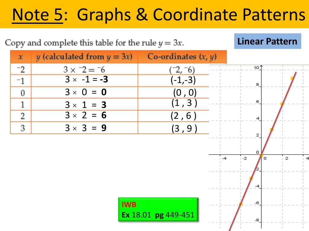 Note 5: Graphs & Coordinate Patterns Linear Pattern 3 × -1 = -3 (-1,-3) 3 × 0 = 0 (0 , 0) (1 , 3 ) 3 × 1 = 3 3 × 2 = 6 (2 , 6 ) 3 × 3 = 9 (3 , 9 ) IWB Ex 18.01 pg 449-451