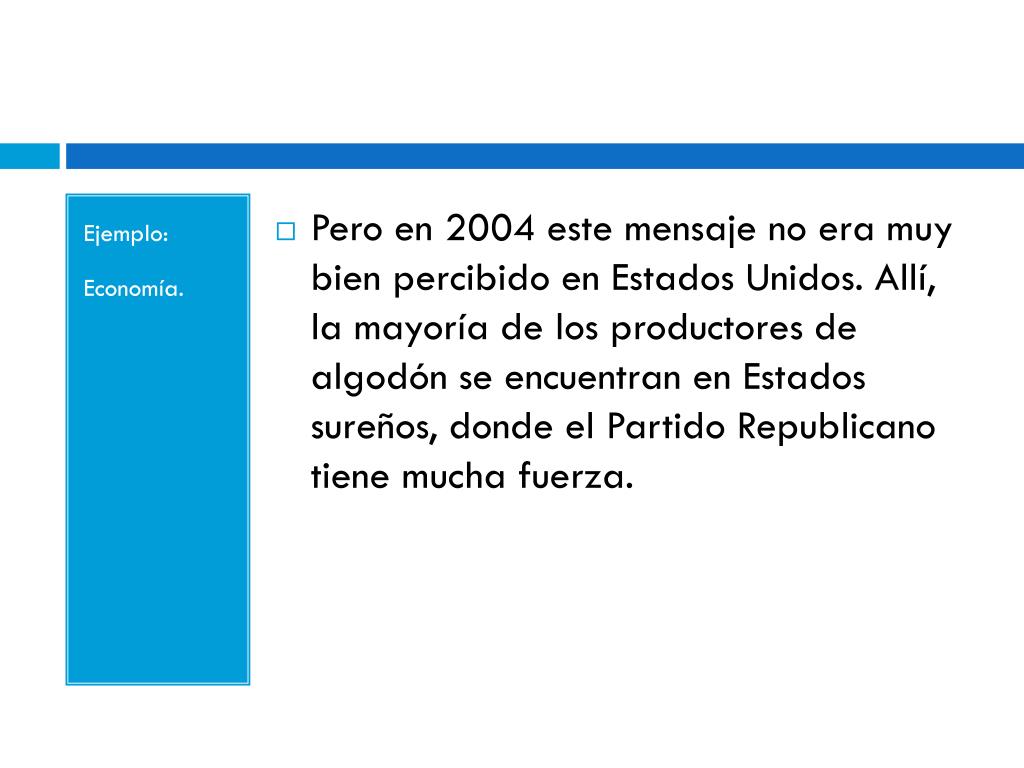 Ejemplo: Economía. • Pero en 2004 este mensaje no era muy bien percibido en Estados Unidos. Allí, la mayoría de los productores de algodón se encuentran en Estados sureños, donde el Partido Republicano tiene mucha fuerza.