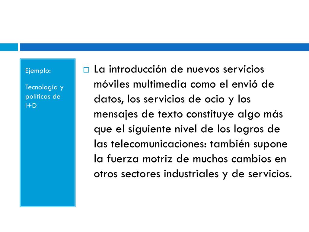 Ejemplo: Tecnología y políticas de I+D • La introducción de nuevos servicios móviles multimedia como el envió de datos, los servicios de ocio y los mensajes de texto constituye algo más que el siguiente nivel de los logros de las telecomunicaciones: también supone la fuerza motriz de muchos cambios en otros sectores industriales y de servicios.