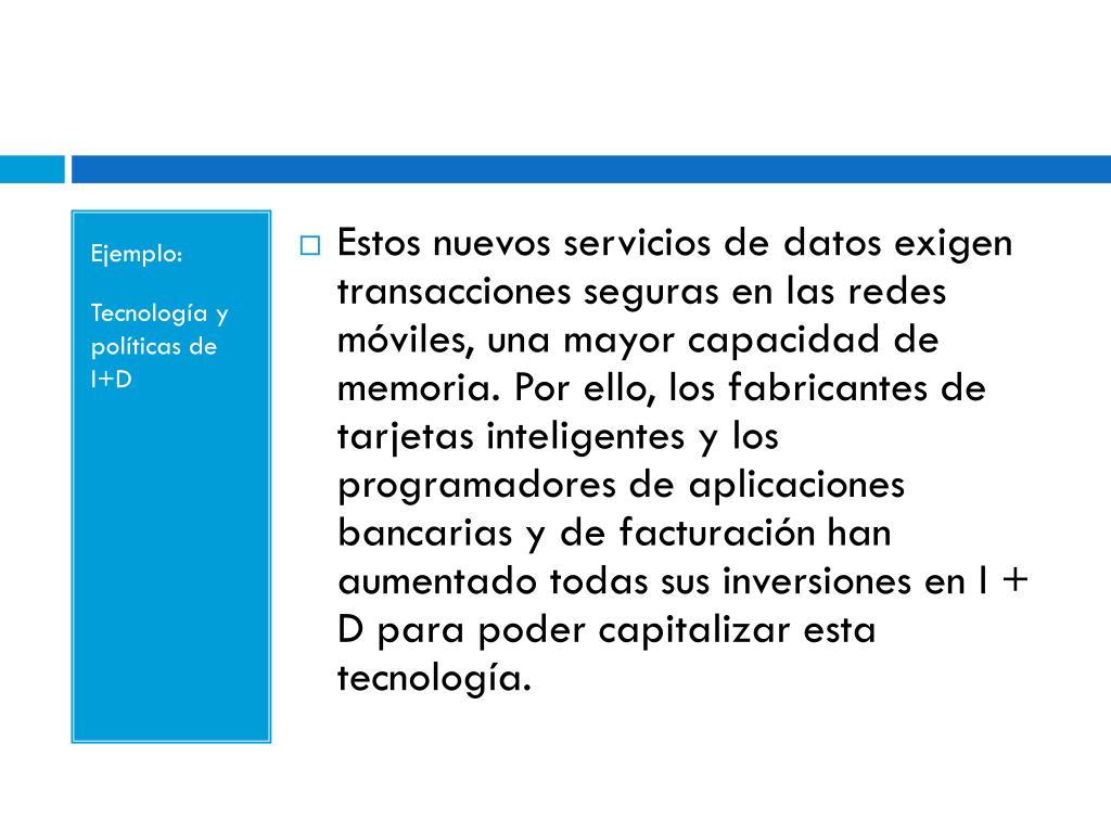 Ejemplo: Tecnología y políticas de I+D • Estos nuevos servicios de datos exigen transacciones seguras en las redes móviles, una mayor capacidad de memoria. Por ello, los fabricantes de tarjetas inteligentes y los programadores de aplicaciones bancarias y de facturación han aumentado todas sus inversiones en I + D para poder capitalizar esta tecnología.