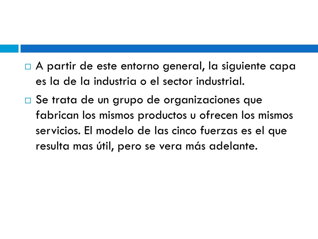 A partir de este entorno general, la siguiente capa es la de la industria o el sector industrial. • Se trata de un grupo de organizaciones que fabrican los mismos productos u ofrecen los mismos servicios. El modelo de las cinco fuerzas es el que resulta mas útil, pero se vera más adelante.