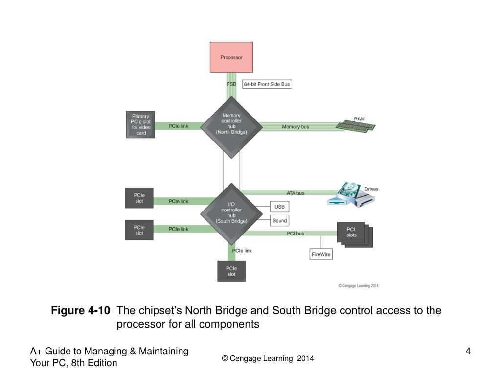 Figure 4-10 The chipset’s North Bridge and South Bridge control access to the processor for all components A+ Guide to Managing & Maintaining Your PC, 8th Edition
