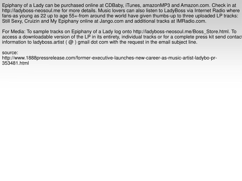 Epiphany of a Lady can be purchased online at CDBaby, iTunes, amazonMP3 and Amazon.com. Check in at http://ladyboss-neosoul.me for more details. Music lovers can also listen to LadyBoss via Internet Radio where fans-as young as 22 up to age 55+-from around the world have given thumbs-up to three uploaded LP tracks: Still Sexy, Cruizin and My Epiphany online at Jango.com and additional tracks at IMRadio.com. For Media: To sample tracks on Epiphany of a Lady log onto http://ladyboss-neosoul.me/Boss_Store.html. To access a downloadable version of the LP in its entirety, individual tracks or for a complete press kit send contact information to ladyboss.artist ( @ ) gmail dot com with the request in the email subject line. source: http://www.1888pressrelease.com/former-executive-launches-new-career-as-music-artist-ladybo-pr-353481.html