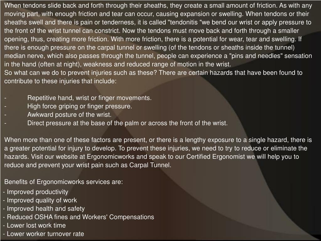 When tendons slide back and forth through their sheaths, they create a small amount of friction. As with any moving part, with enough friction and tear can occur, causing expansion or swelling. When tendons or their sheaths swell and there is pain or tenderness, it is called "tendonitis "we bend our wrist or apply pressure to the front of the wrist tunnel can constrict. Now the tendons must move back and forth through a smaller opening, thus, creating more friction. With more friction, there is a potential for wear, tear and swelling. If there is enough pressure on the carpal tunnel or swelling (of the tendons or sheaths inside the tunnel) median nerve, which also passes through the tunnel, people can experience a "pins and needles" sensation in the hand (often at night), weakness and reduced range of motion in the wrist. So what can we do to prevent injuries such as these? There are certain hazards that have been found to contribute to these injuries that include: - Repetitive hand, wrist or finger movements. - High force griping or finger pressure. - Awkward posture of the wrist. - Direct pressure at the base of the palm or across the front of the wrist. When more than one of these factors are present, or there is a lengthy exposure to a single hazard, there is a greater potential for injury to develop. To prevent these injuries, we need to try to reduce or eliminate the hazards. Visit our website at Ergonomicworks and speak to our Certified Ergonomist we will help you to reduce and prevent your wrist pain such as Carpal Tunnel. Benefits of Ergonomicworks services are: - Improved productivity - Improved quality of work - Improved health and safety - Reduced OSHA fines and Workers' Compensations - Lower lost work time - Lower worker turnover rate