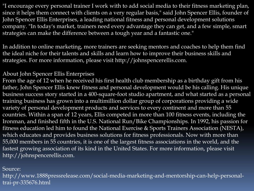 "I encourage every personal trainer I work with to add social media to their fitness marketing plan, since it helps them connect with clients on a very regular basis," said John Spencer Ellis, founder of John Spencer Ellis Enterprises, a leading national fitness and personal development solutions company. "In today's market, trainers need every advantage they can get, and a few simple, smart strategies can make the difference between a tough year and a fantastic one." In addition to online marketing, more trainers are seeking mentors and coaches to help them find the ideal niche for their talents and skills and learn how to improve their business skills and strategies. For more information, please visit http://johnspencerellis.com. About John Spencer Ellis Enterprises From the age of 12 when he received his first health club membership as a birthday gift from his father, John Spencer Ellis knew fitness and personal development would be his calling. His unique business success story started in a 400-square-foot studio apartment, and what started as a personal training business has grown into a multimillion dollar group of corporations providing a wide variety of personal development products and services to every continent and more than 55 countries. Within a span of 12 years, Ellis competed in more than 100 fitness events, including the Ironman, and finished fifth in the U.S. National Run/Bike Championships. In 1992, his passion for fitness education led him to found the National Exercise & Sports Trainers Association (NESTA), which educates and provides business solutions for fitness professionals. Now with more than 55,000 members in 55 countries, it is one of the largest fitness associations in the world, and the fastest growing association of its kind in the United States. For more information, please visit http://johnspencerellis.com. Source: http://www.1888pressrelease.com/social-media-marketing-and-mentorship-can-help-personal-trai-pr-335676.html