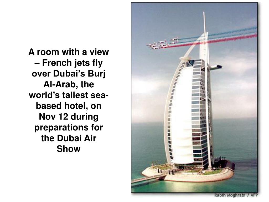 A room with a view – French jets fly over Dubai’s Burj Al-Arab, the world’s tallest sea-based hotel, on Nov 12 during preparations for the Dubai Air Show