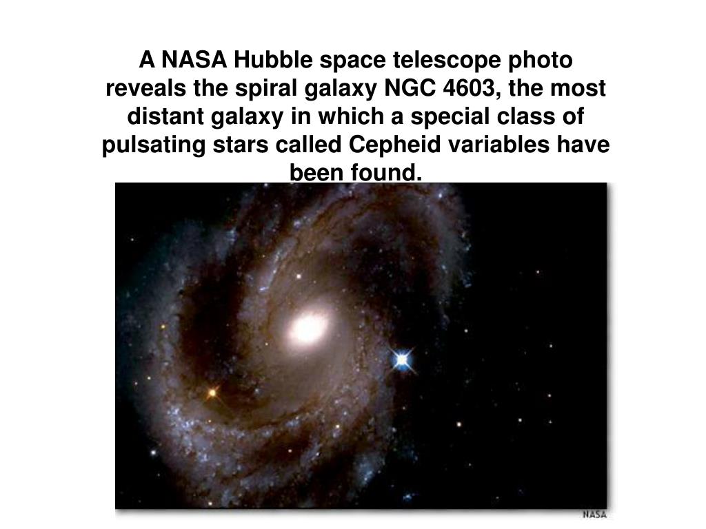 A NASA Hubble space telescope photo reveals the spiral galaxy NGC 4603, the most distant galaxy in which a special class of pulsating stars called Cepheid variables have been found.