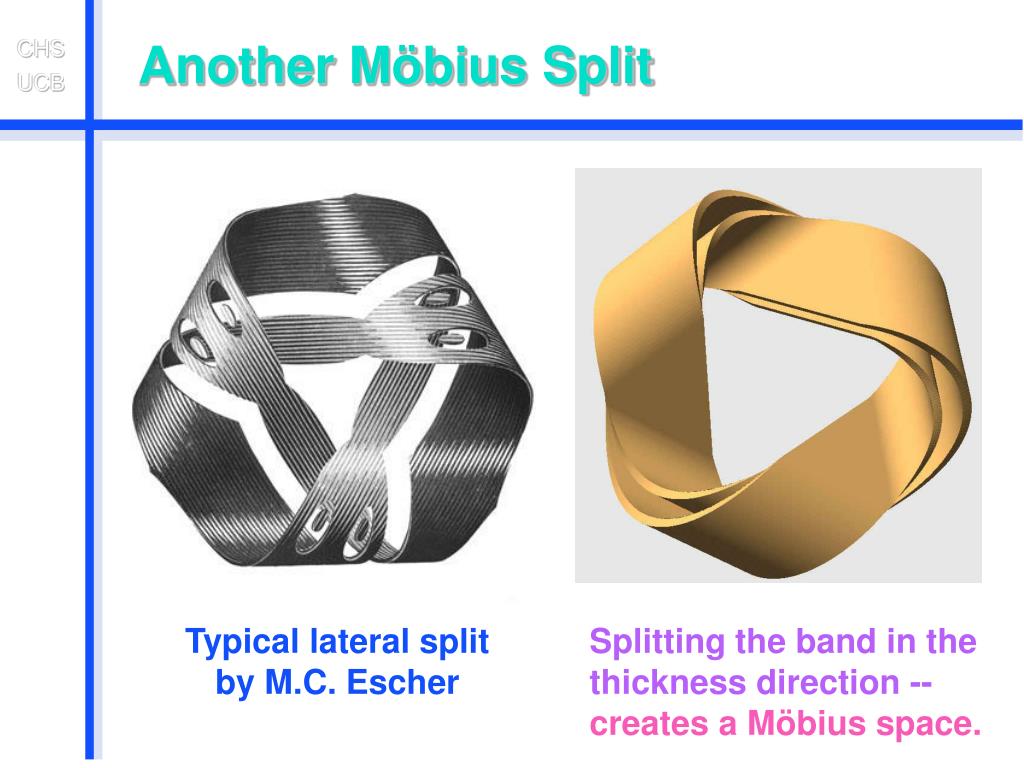 Another Möbius Split Typical lateral splitby M.C. Escher Splitting the band in the thickness direction --creates a Möbius space.