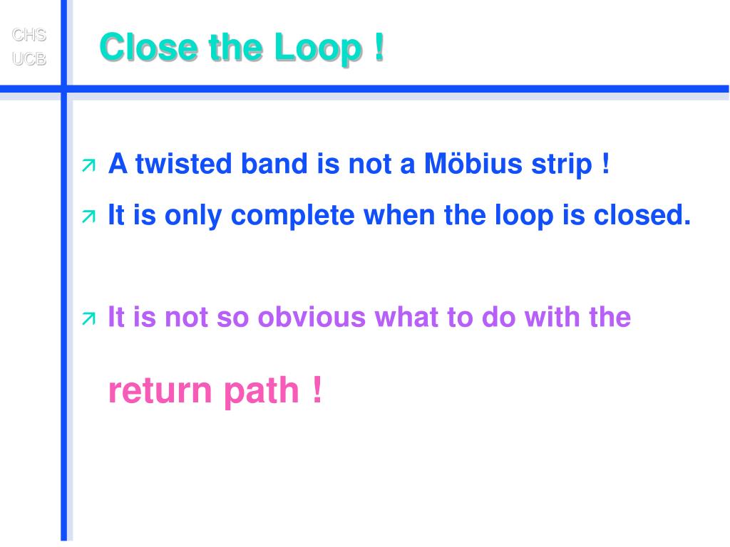 Close the Loop ! • A twisted band is not a Möbius strip ! • It is only complete when the loop is closed. • It is not so obvious what to do with thereturn path !