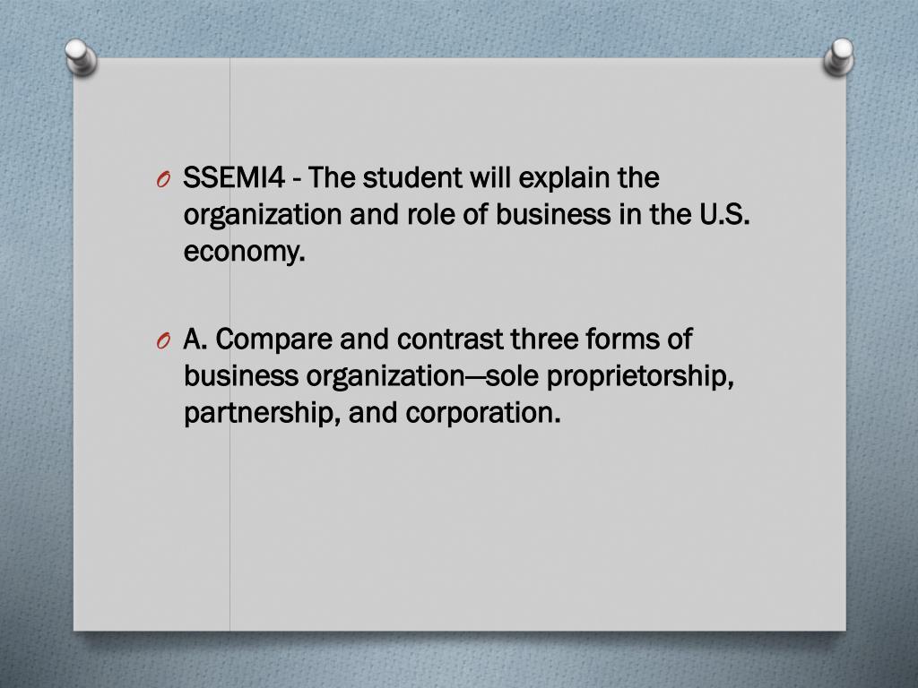 SSEMI4 - The student will explain the organization and role of business in the U.S. economy. • A. Compare and contrast three forms of business organization—sole proprietorship, partnership, and corporation.