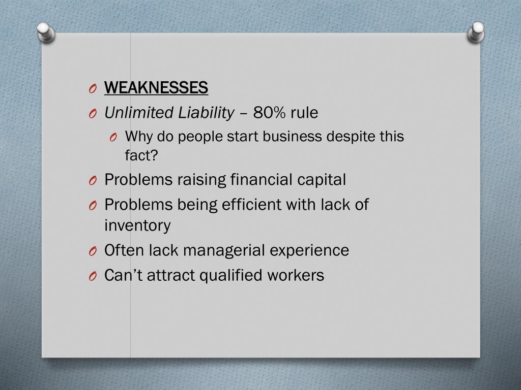 WEAKNESSES • Unlimited Liability – 80% rule • Why do people start business despite this fact? • Problems raising financial capital • Problems being efficient with lack of inventory • Often lack managerial experience • Can’t attract qualified workers