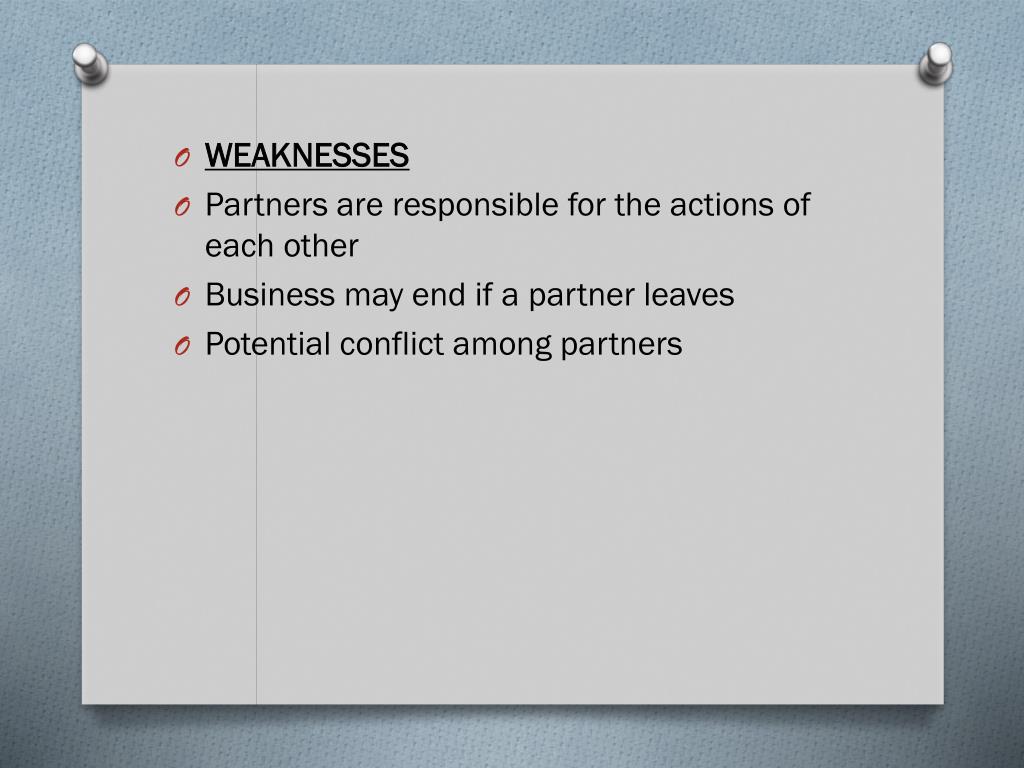 WEAKNESSES • Partners are responsible for the actions of each other • Business may end if a partner leaves • Potential conflict among partners