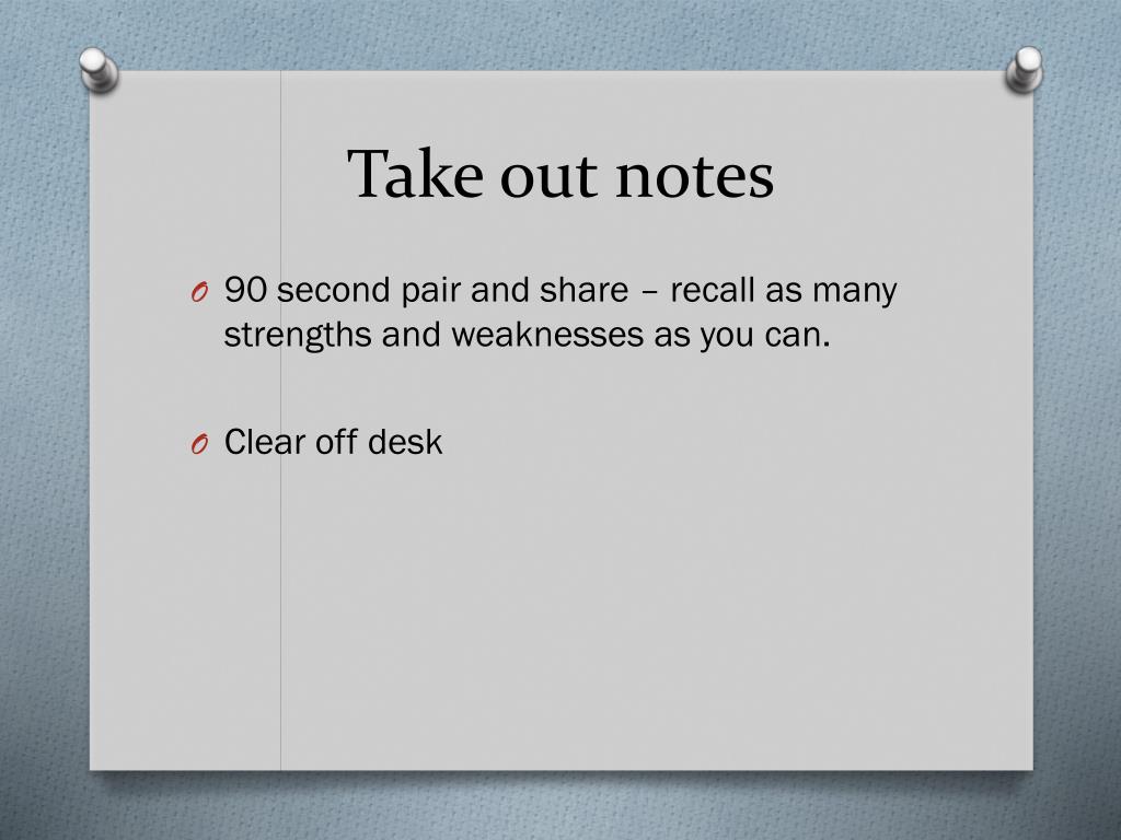 Take out notes • 90 second pair and share – recall as many strengths and weaknesses as you can. • Clear off desk