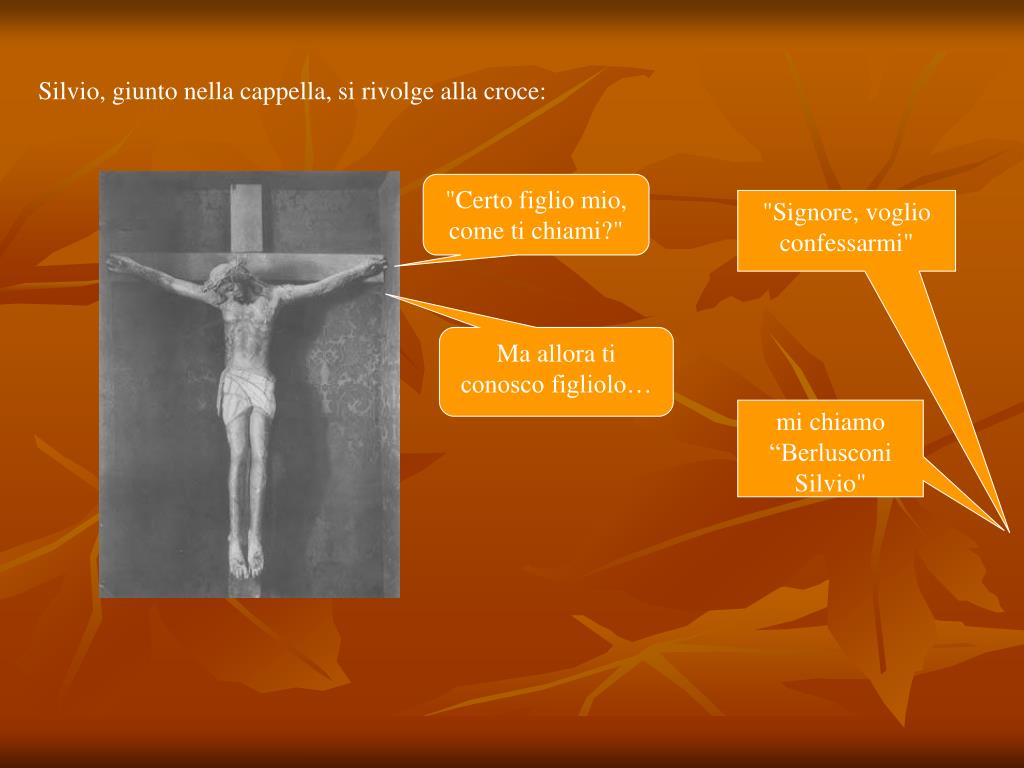 Silvio, giunto nella cappella, si rivolge alla croce: "Certo figlio mio, come ti chiami?" "Signore, voglio confessarmi" Ma allora ti conosco figliolo… mi chiamo “Berlusconi Silvio"