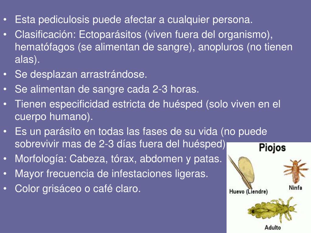 Esta pediculosis puede afectar a cualquier persona. • Clasificación: Ectoparásitos (viven fuera del organismo), hematófagos (se alimentan de sangre), anopluros (no tienen alas). • Se desplazan arrastrándose. • Se alimentan de sangre cada 2-3 horas. • Tienen especificidad estricta de huésped (solo viven en el cuerpo humano). • Es un parásito en todas las fases de su vida (no puede sobrevivir mas de 2-3 días fuera del huésped). • Morfología: Cabeza, tórax, abdomen y patas. • Mayor frecuencia de infestaciones ligeras. • Color grisáceo o café claro.