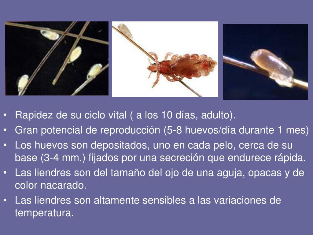 Rapidez de su ciclo vital ( a los 10 días, adulto). • Gran potencial de reproducción (5-8 huevos/día durante 1 mes) • Los huevos son depositados, uno en cada pelo, cerca de su base (3-4 mm.) fijados por una secreción que endurece rápida. • Las liendres son del tamaño del ojo de una aguja, opacas y de color nacarado. • Las liendres son altamente sensibles a las variaciones de temperatura.