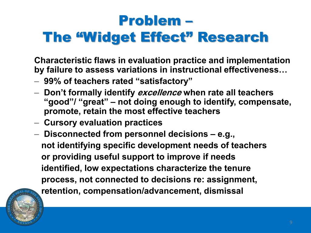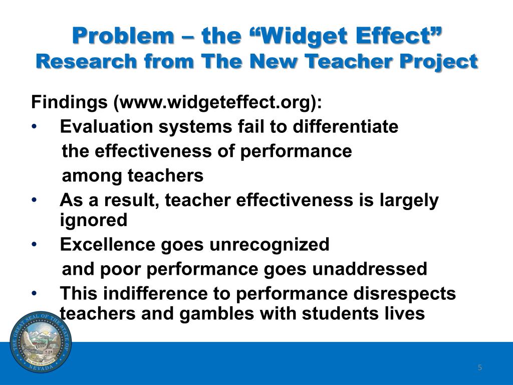 Problem – the “Widget Effect”Research from The New Teacher Project Findings (www.widgeteffect.org): • Evaluation systems fail to differentiate the effectiveness of performance among teachers • As a result, teacher effectiveness is largely ignored • Excellence goes unrecognized and poor performance goes unaddressed • This indifference to performance disrespects teachers and gambles with students lives